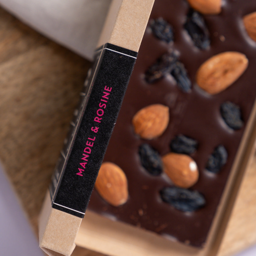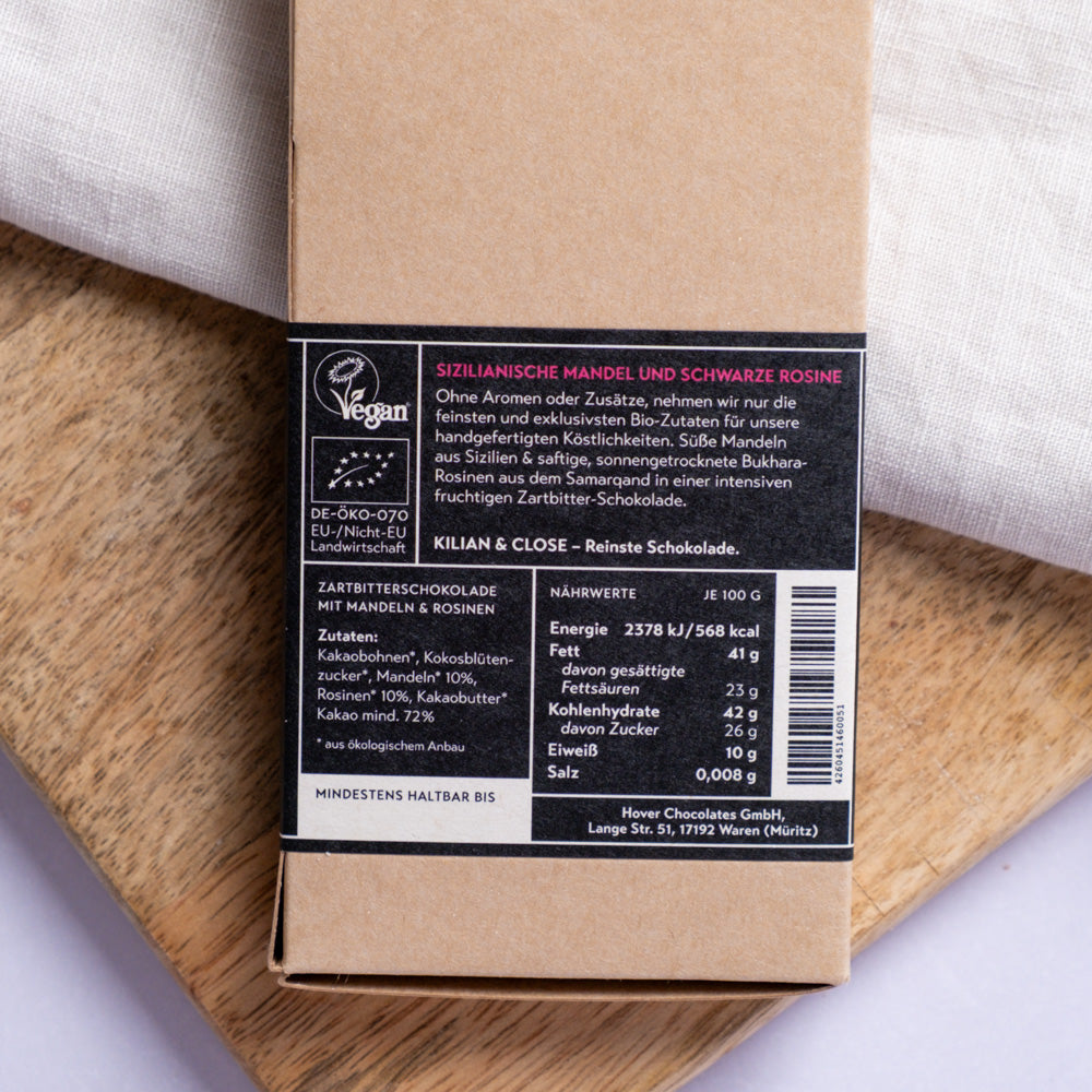 Die Mandel-Rosine 72% Bio & Vegane Edelbitter-Schokolade vereint fein geröstete sizilianische Mandeln mit den aromatischen Bukhara-Rosinen aus der Region Samarkand im Süden Usbekistans. Veredelt mit edlem Panama-Kakao, entsteht eine Tafel von außergewöhnlicher Geschmacksvielfalt – herb, süß, leicht sauer und mit feinen Röstaromen.