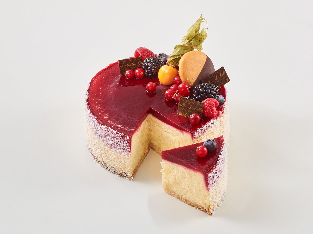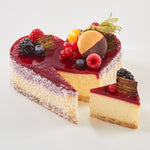 Cream cheese , sugar, whipped cream, raspberry puree (raspberries 100%), white chocolate coating (sugar, cocoa butter (33%), whole milk powder, soy lecithin (E322) ), crème fraîche, eggs , gluten-free cake flour (rice flour, potato starch, tapioca starch, xanthan gum (E415)), vegetable fat (vegetable oils and fats (rapeseed; coconut; sunflower), water, emulsifier mono- and diglycerides, salt), corn starch, lemon, vanilla, pectin, sea salt