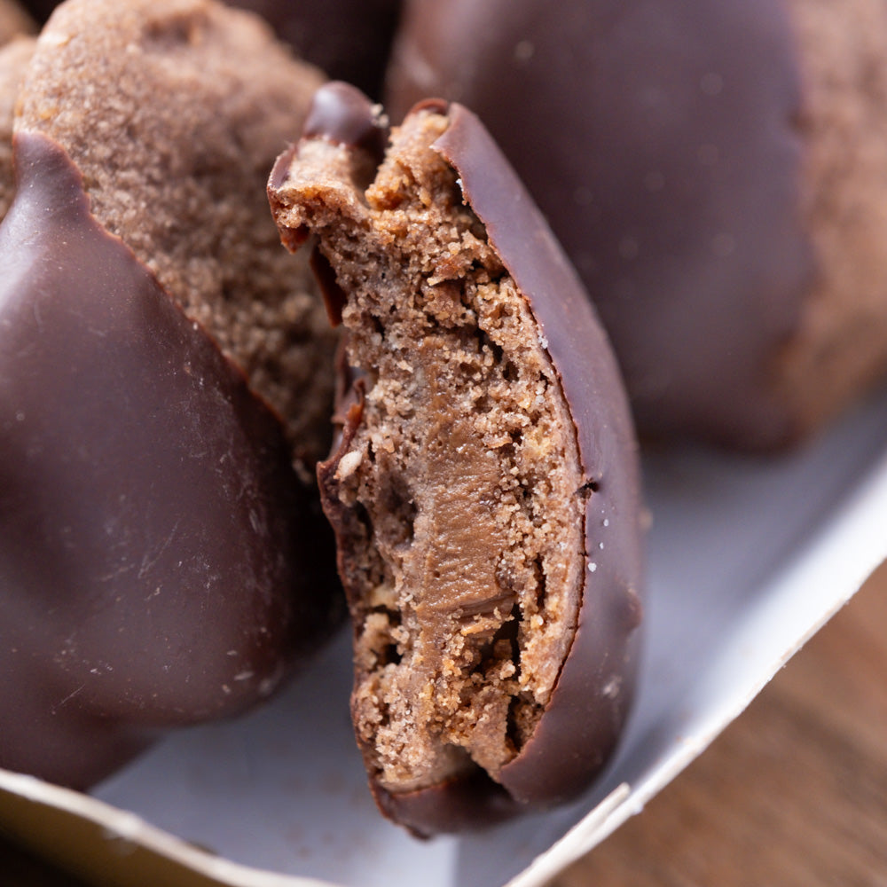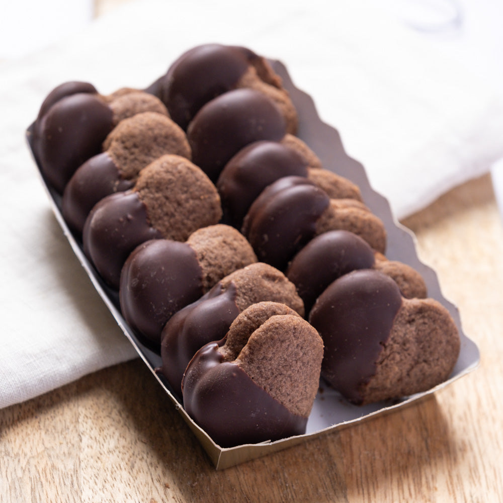 The way to our hearts? Definitely through vegan, completely gluten-free nougat hearts, naturally made with love and craftsmanship in our bakery. They're made from delicate, vegan chocolate-almond biscuits and topped with a creamy hazelnut nougat layer that makes them simply irresistible. They become truly heavenly when dipped in a 70% fine chocolate coating—a perfect combination.
