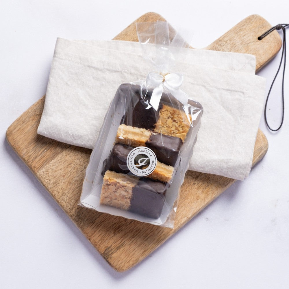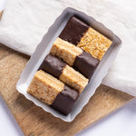 Unsere schokoladige Leckerei, ein wunderbar knackiges, glutenfreies Mandelgebäck, besteht aus einem Mürbeteig mit Marzipan und einer gerösteten Mandeldecke, die sie leicht knusprig machen. Getoppt mit Edelbitterkuvertüre sind sie dann einfach unwiderstehlich.